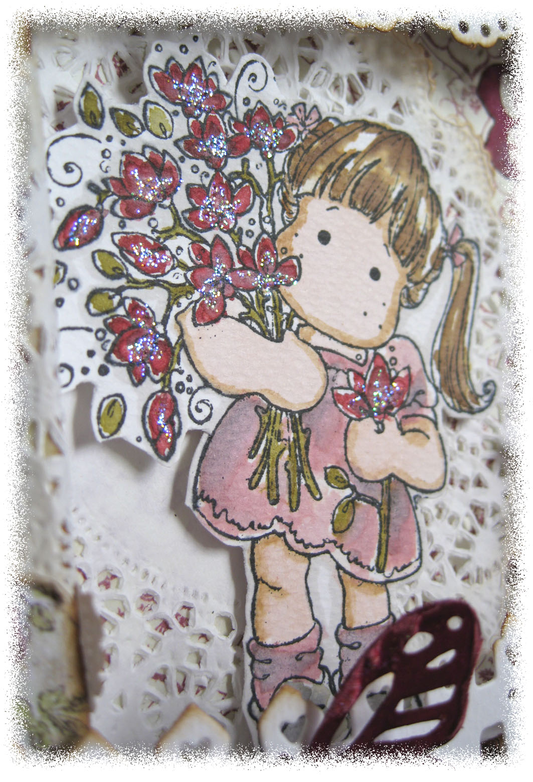 Jag gillar den här stämpeln från Lili of the Valley. Den är så fin. Den är målad med Promarker samt Polychrome pennor. Jag har glittrat med Stickles stardust såklart. Runt motivet har jag använt stämplar från Stempelgledje.